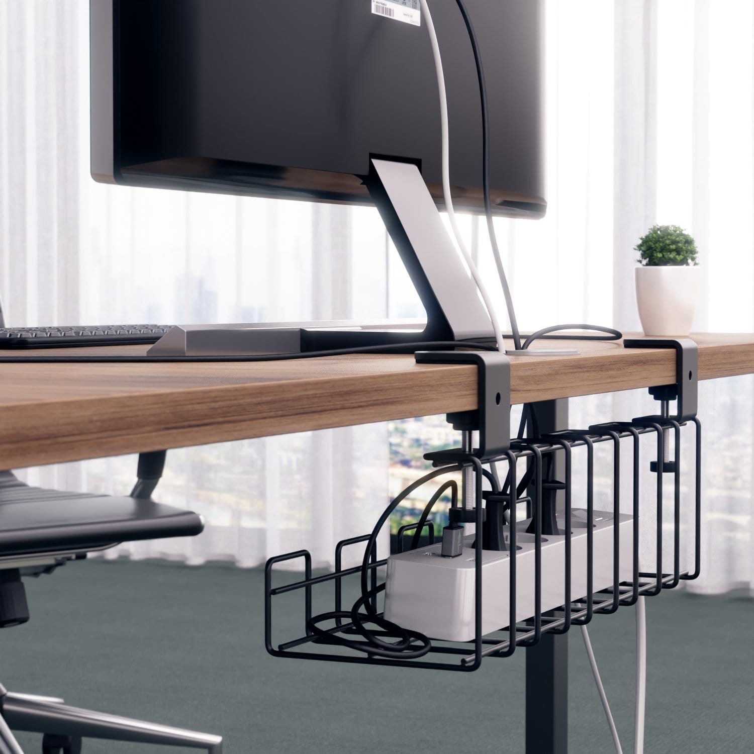 Die klemmbaren Kabelhalter verbergen klobige Mehrfachsteckdosen, Netzteile und unschönen Kabelsalat – platzsparend und geschützt unter dem Tisch, an Tischkanten und Schränken. Auch eine Wandmontage ist mit diesem Kabelkorb möglich.
