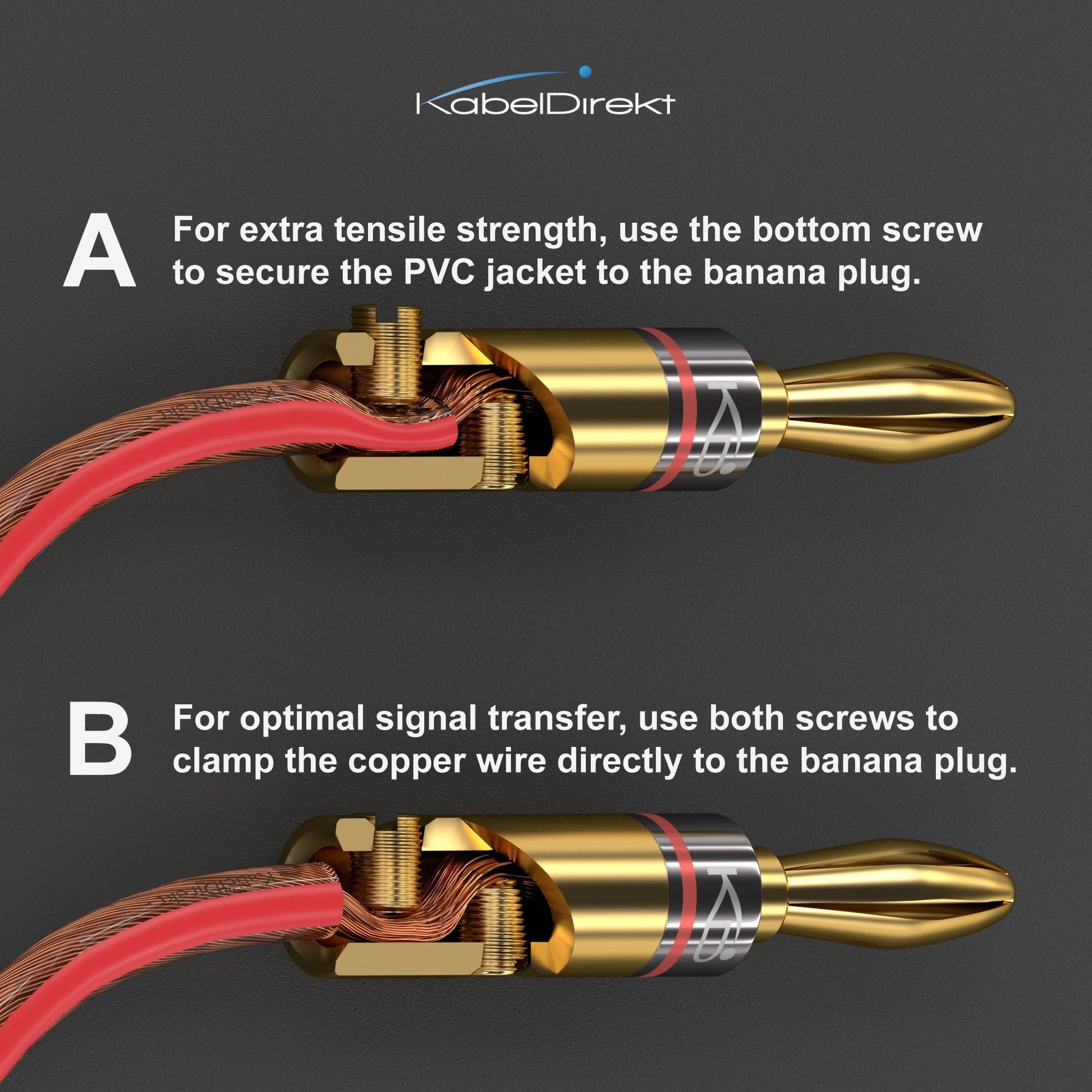 Mit den Bananensteckern von KabelDirekt können Sie Ihre Lautsprecherkabel jederzeit einfach, schnell und flexibel mit Ihren Lautsprechern verbinden.