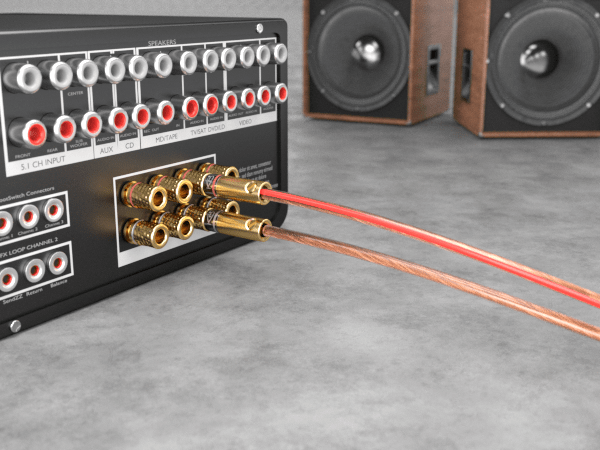 - HINWEIS: Viele Verstärker-Anschlüsse sind mit kaum sichtbaren Schutzkappen versehen. Diese müssen vor dem Einsatz der Bananenstecker entfernt werden. Weitere Hinweise enthält die Verstärker-Anleitung